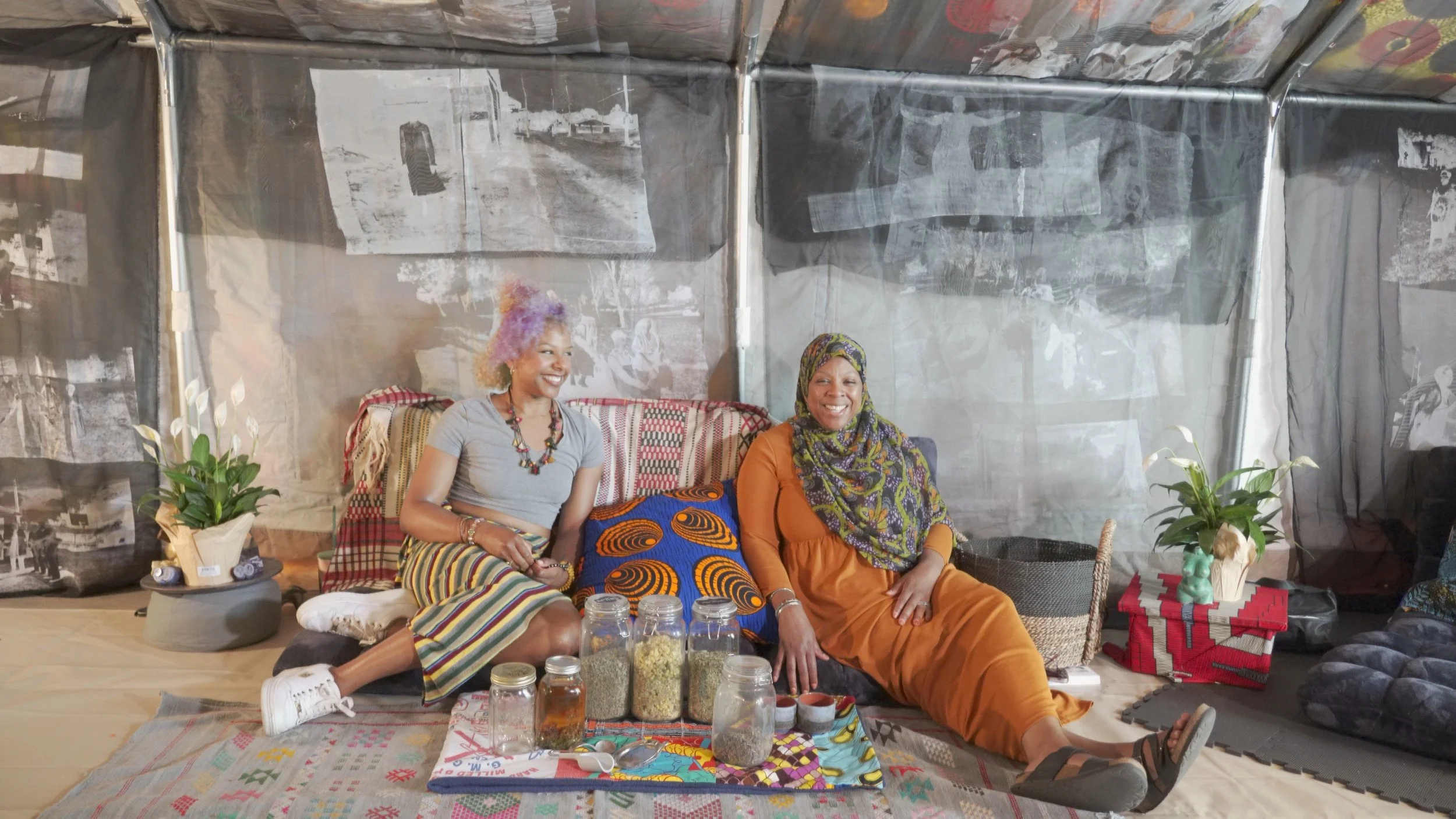 The Temple of Our Survival filmset has travelled to a total of eight sites around the country. At each of these, the artist held workshops using herbs grown in her grandmother’s garden and conducted interviews with local care workers, land stewards, and cultural workers, each of whom shared their own stories of and strategies for survival.